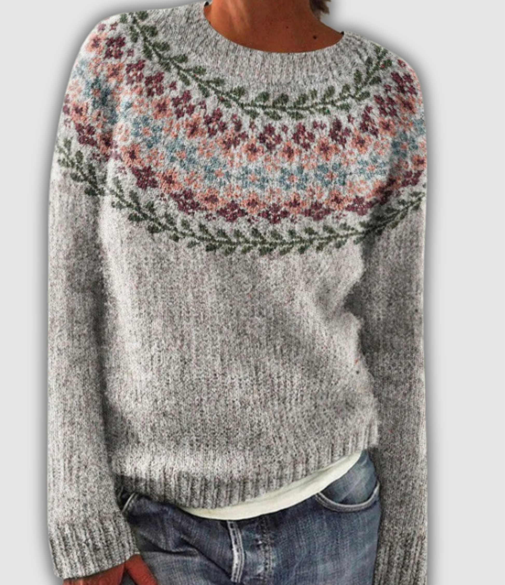 The Sierra sweater combines timeless Nordic craftsmanship with delicate floral-inspired patterns. Its soft knit fabric and cozy fit make it a versatile winter staple. The warm neutral base, paired with subtle earthy tones in the design, creates an effortlessly chic look perfect for everyday wear.